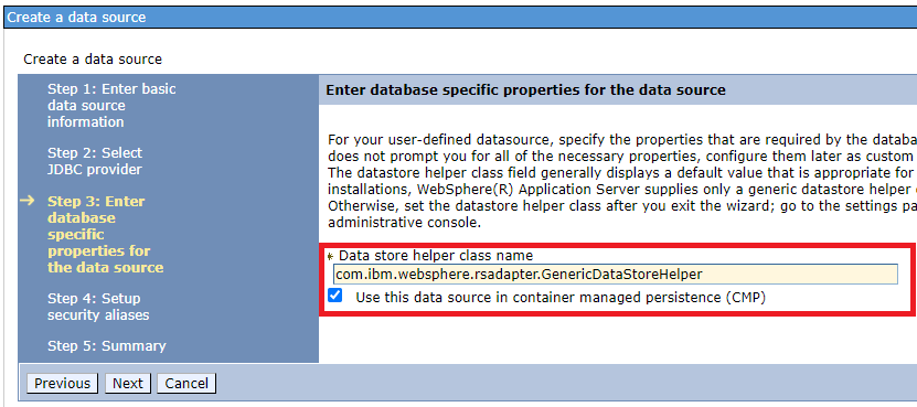 Data store helper class name指定为如下 com.ibm.websphere.rsadapter.GenericDataStoreHelper